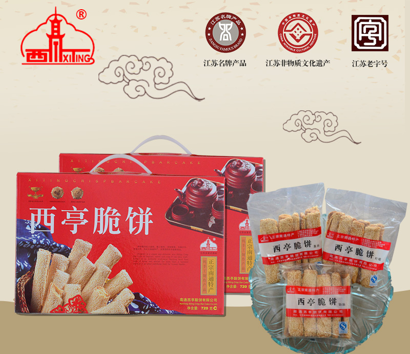 曾任北洋政府農林工商總長的清末狀元張謇先生回故鄉省親祭祖時,品嘗了“復興店”的西亭脆餅,不禁大加贊賞,并為該店親筆題寫了“復隆茂”字號,寓意:生意興隆,財源茂盛。張謇先生回京時,把西亭脆餅作為家鄉土特產,饋贈京都的達官貴人,駐華使節及中外客商,使西亭脆餅名聲大振,成為南通地區的地方名產。在日本、新加坡、菲律賓等東南亞地區也有一定的影響。